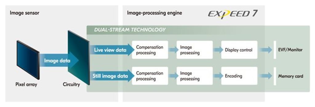Nikon 的雙重串流技術由全新疊加式 CMOS (互補性金屬氧化物半導體器件) 感應器及 EXPEED 7 引擎造就,分別處理實時顯示影像 (包括 EVF 檢視畫面)、以及要攝錄的靜態影像。此專用實時顯示影像處理機制正是實時觀景器的基礎,可令畫面更流暢,每分每刻展露無遺。