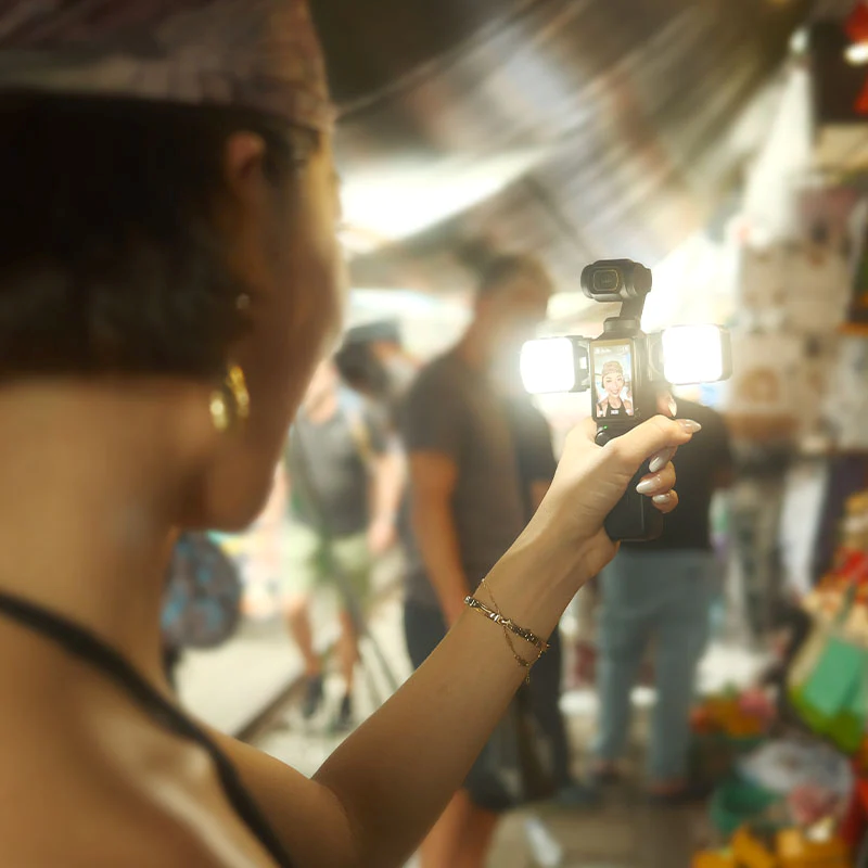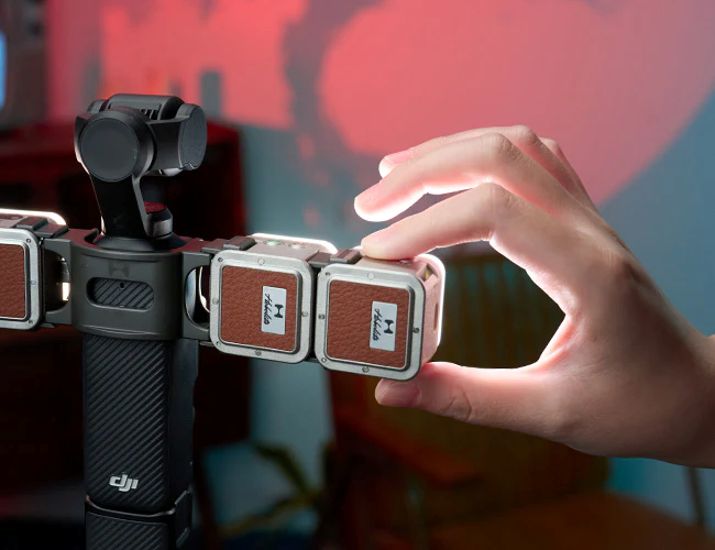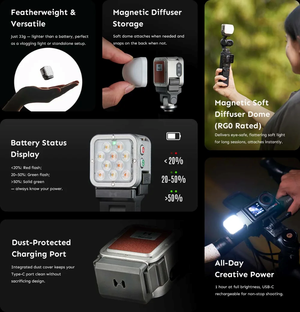 Atom 2 口袋燈組包含兩個 Atom 2、兩個磁性軟擴散罩、雙燈連接器、一個 DJI Pocket 3 連接器、兩個防塵 Type-C 埠、一條 Type-C 充電線及一個袋子。