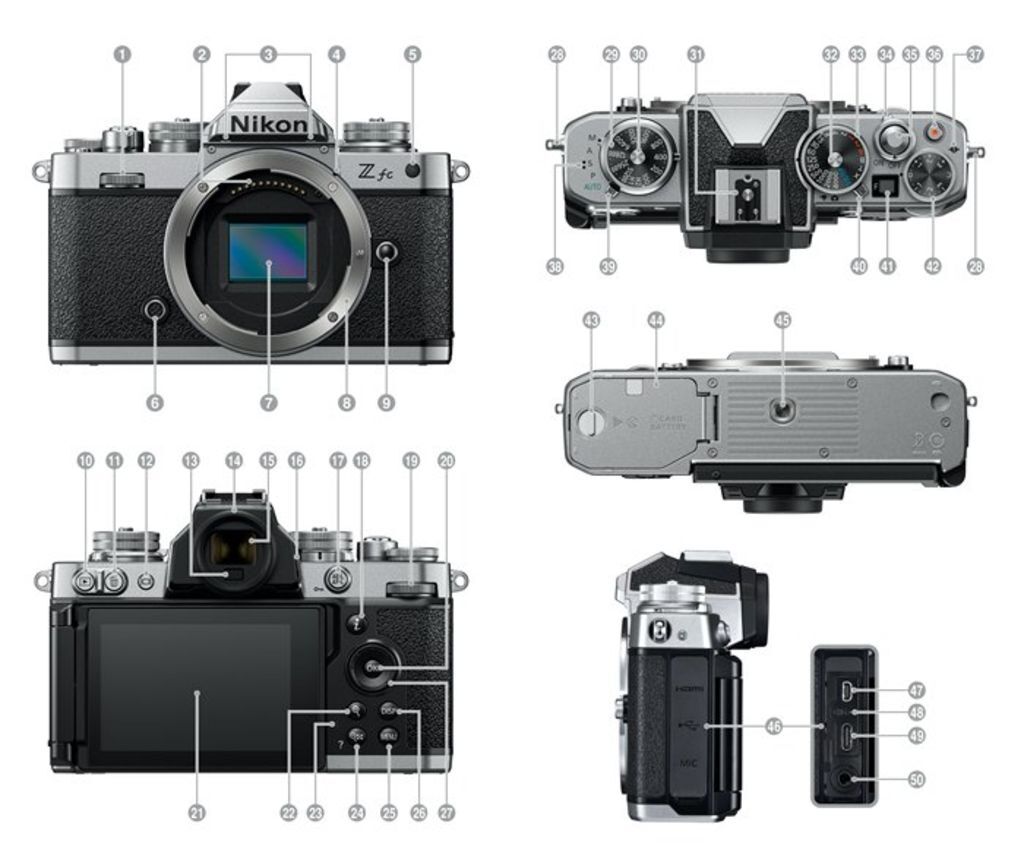 | 6 | Fn 按鍵 | 19 | 主指令撥盤 | 32 | 快門速度撥盤鎖定釋放按鍵 | 45 | 三腳架插孔 |