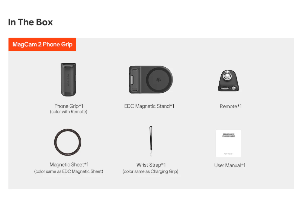 3. 磁性藍牙遙控模組:磁性附著於握把上。支援 Android 與 iOS,提供快速相機啟動、半按對焦、拍攝、連續拍攝、模式切換、變焦調整及前後鏡頭切換(部分機型如 vivo、Samsung、Sony 可能有相容性限制)。